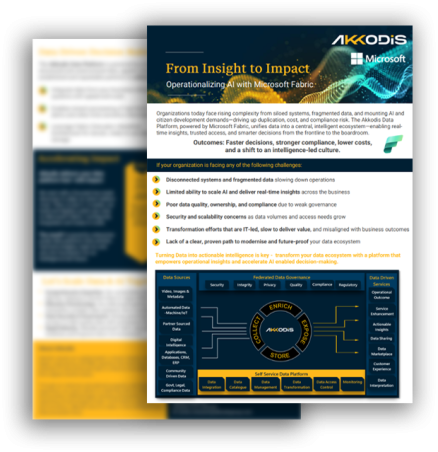 Unlock the full potential of your data and scale AI with confidence. This infosheet explores how the Akkodis Data Platform—powered by Microsoft Fabric—unifies fragmented systems, streamlines governance, and delivers real-time insights across your business. Whether you're struggling with disconnected data, compliance challenges, or slow AI adoption, discover a proven approach to accelerate transformation and enable smarter, faster decisions from the frontline to the boardroom.