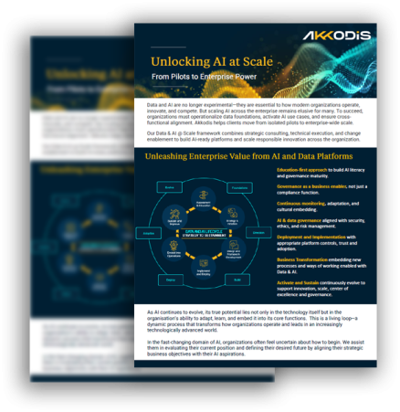 Akkodis helps organizations move from pilots to enterprise-wide adoption through the Data & AI @ Scale framework—combining strategy, delivery, and change management to embed AI and enable continuous innovation.