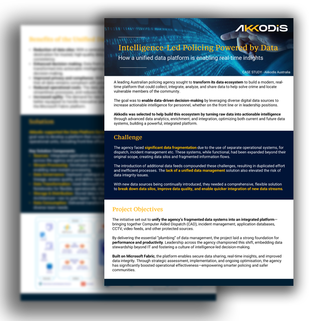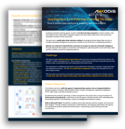 A leading Australian policing agency partnered with Akkodis to unify its fragmented data systems and build a secure, real-time intelligence platform. Powered by Microsoft Fabric and robust governance, the new ecosystem enables faster, data-driven decisions—empowering frontline officers and leadership to act with greater precision and agility. This transformation marks a critical step toward smarter, safer, and more responsive policing.
