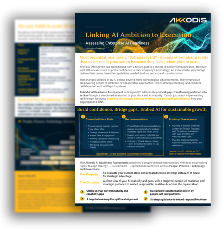 Download this infosheet to learn how Akkodis’ AI Readiness Assessment helps close these gaps by evaluating your organization’s data and AI maturity—empowering you to move from strategy to execution and embed intelligence throughout your operations.